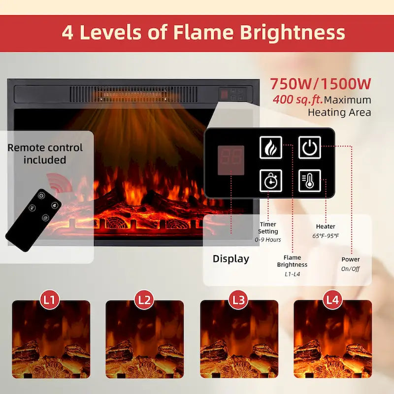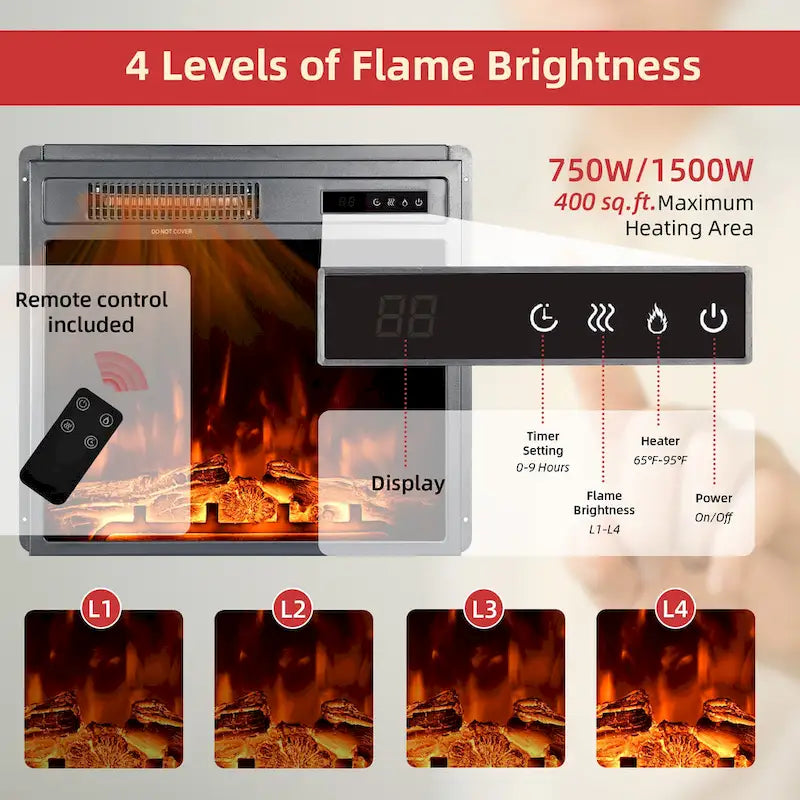 The electric fireplace is equipped with an advanced overheat protection system and flame-retardant nylon, ensuring it automatically shuts off before overheating. Additionally, once turned off, the heater fan continues to circulate cool air for 30 seconds to minimize any overheating risks. The temperature can be effortlessly controlled using the provided remote. Certified by ETL, this product is environmentally friendly, safe, child-friendly, and designed for worry-free use.