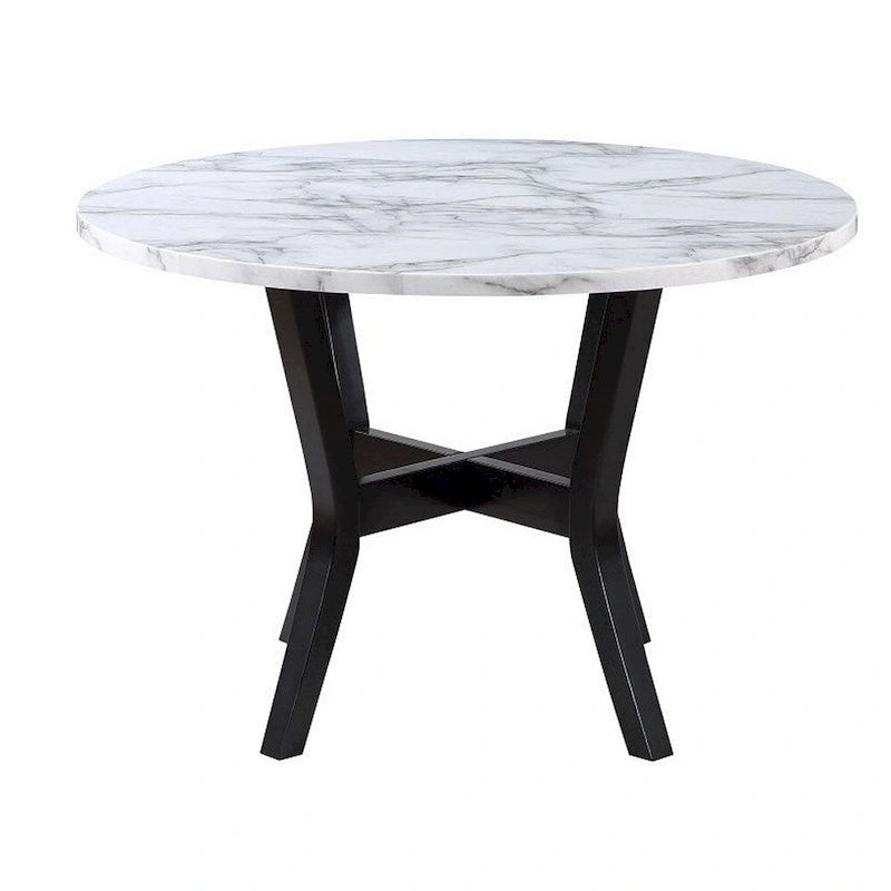 Create a cozy and elegant dining space or kitchen nook with our five piece dining table and chairs set. This set includes a round dining table and four chairs made of high quality wood and composite wood with a black finish that matches any decor theme. The table has a stunning white faux stone top, while the chairs are upholstered in comfortable fabric with foam cushioning and tufted backrests.