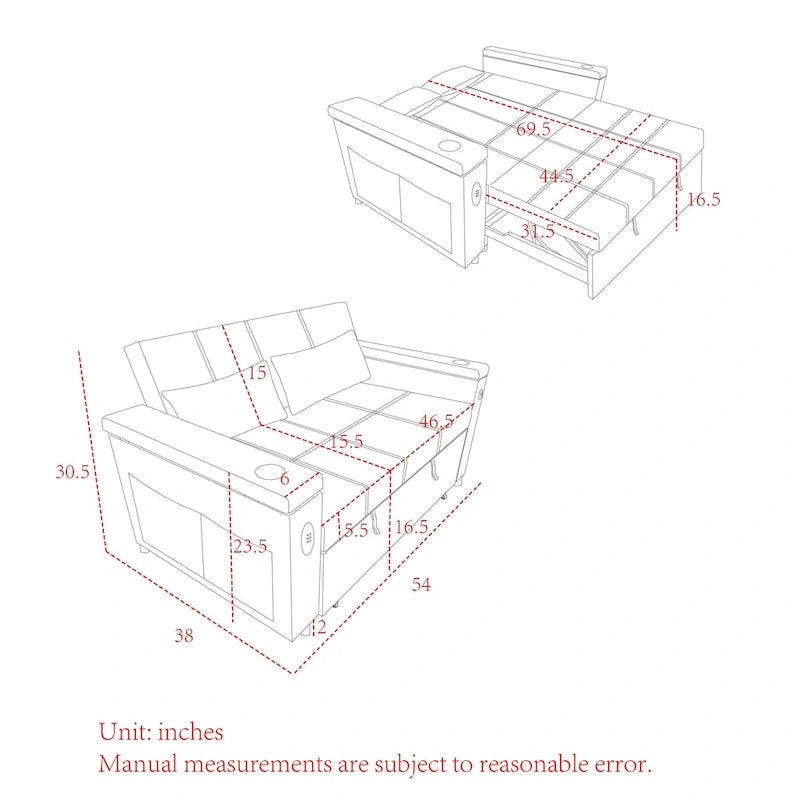 _Product Description:This modern style adjustable sofa bed is made of premium chenille fabric and high-density sponge silk combination, showing the quality and comfort, loved by everyone. _ Multi-functional pull-out sofa bed. Simply pull out and lift the bed frame underneath the seat and lower the backrest, this double sofa can be quickly transformed into a bed for you to rest. _Adjustable: sofa/recliner/bed, 3 in 1, backrest can be adjusted to 3 positions, 105-180 recline or lie flat, can be used for listening to music, playing games, reading and sleeping. It will make you feel relaxed and comfortable. _Suitable for any scene: this multi-functional pull-out sofa bed can be placed in living room and bedroom, which can accommodate 2 people to watch TV, play games or read, and can also be used as a guest or children's bed, with modern and space-saving design. It is definitely a good choice for small rooms, apartments, studios, offices. _USE: It has two straps to assist in pulling out, which can quickly turn the sofa into a bed. The pull-out strapped bed is made of high quality foam and metal iron frame, which can support you to lie firmly on the bed. _STORAGE: The left and right armrest cover opens with storage space inside, there is a water cup holder on top of the armrest cover, and there are storage bags on both sides of the armrests for easy storage. _The side armrests are equipped with USB power port, which can provide supplies when you are resting or sitting on the sofa to play your cell phone.