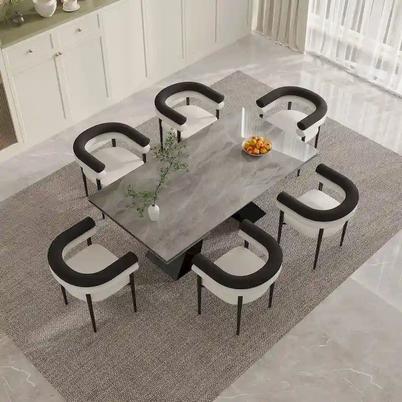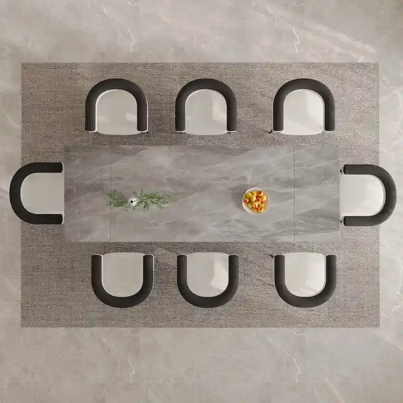 Crafted with meticulous attention to detail, this set features an expandable dining table with a sophisticated sintered stone desktop and sleek metal legs, ensuring a stunning centerpiece for your dining area. Experience the epitome of versatility with our innovative table design, allowing you to effortlessly adjust the size to accommodate intimate gatherings or larger feasts. The durable metal construction ensures stability and longevity, while the captivating sintered stone surface adds a touch of luxury to every meal. Paired with the table are eight meticulously crafted dining chairs, boasting plush.