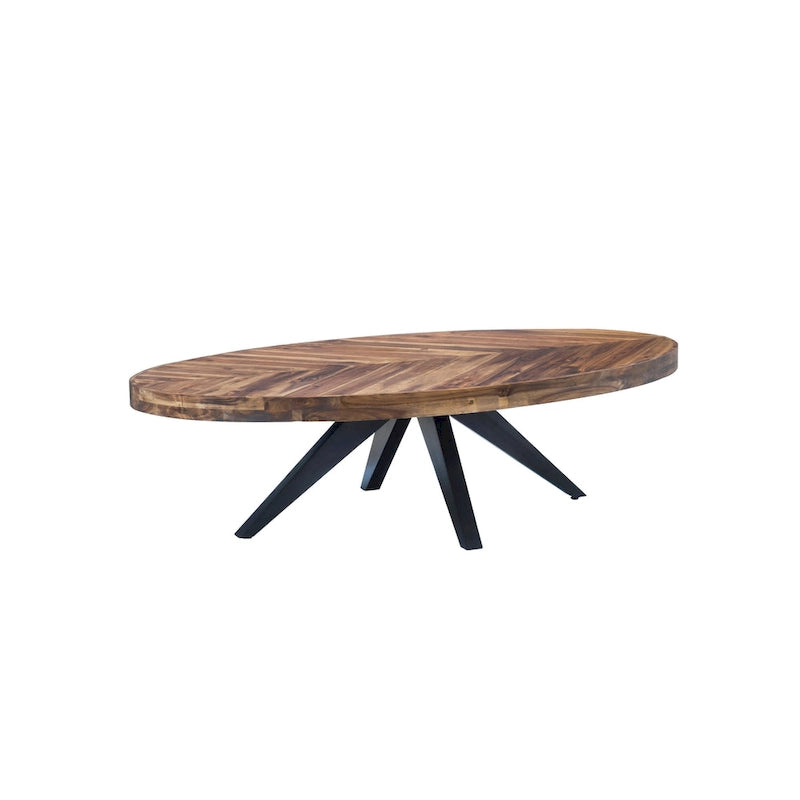 Introduce a touch of rustic charm to your living room with the Aurelle Home Panko Oval Modern Rustic Coffee Table. Made from solid acacia wood, each piece is carefully hand-selected to ensure a varied look and great looking tops. The parquet patterned top features a cappuccino finish and is supported by tripod legs painted in black, adding a modern touch. Measuring 16 inches high x 58 inches wide x 32 inches deep, this coffee table is perfect for entertaining or relaxing with family and friends. This piece is part of the Panko Collection, which also includes rectangular and round dining tables, a console table, a filing cabinet, and an oval dining table. Assembly is required, and this product comes with a 1-year limited warranty (covered for any manufacturer's defect).