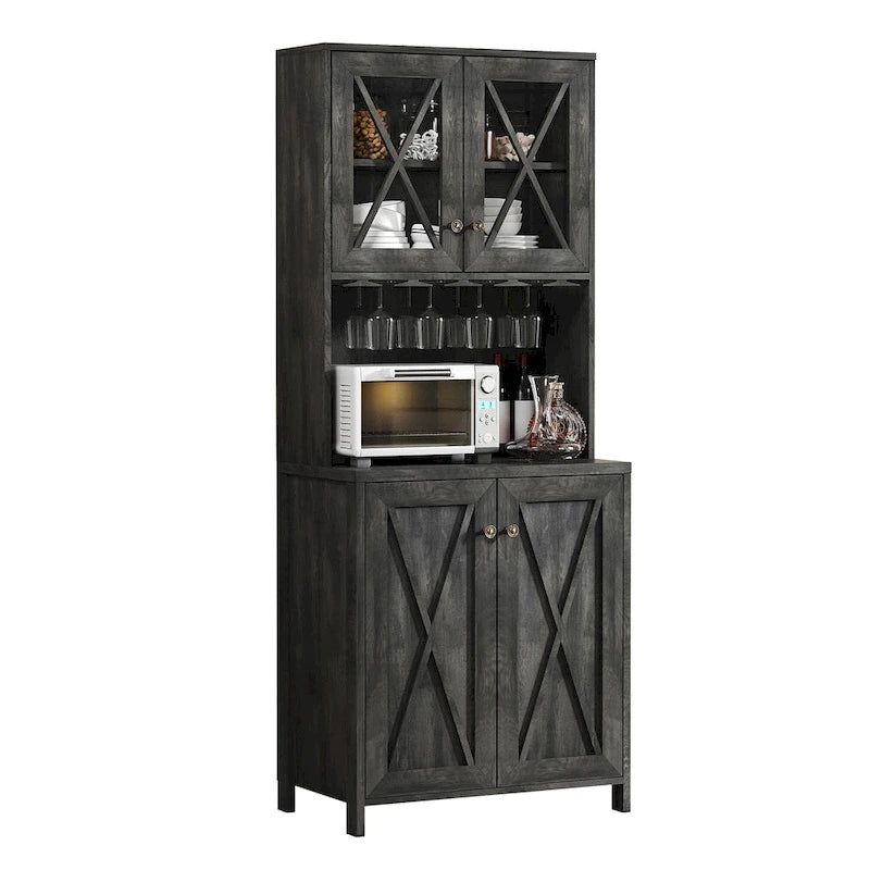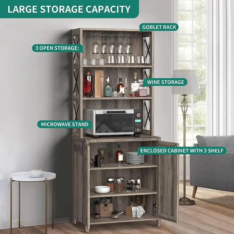This tall bar cabinet is a versatile storage solution for your home. It features a wine rack, open shelves, and a cabinet with hidden shelves to store and display your kitchen, dining, or bar essentials. The grey wash finish and X pattern add a rustic touch to your decor.