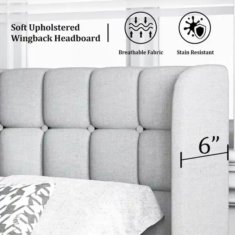This bed frame features a box button-stitched headboard with a thick vertical wingback design, made from breathable and skin-friendly fabric. The stylish wingback and button-tufted headboard beautifully combine modern sophistication with classic comfort, adding an elegant touch to your bedroom.