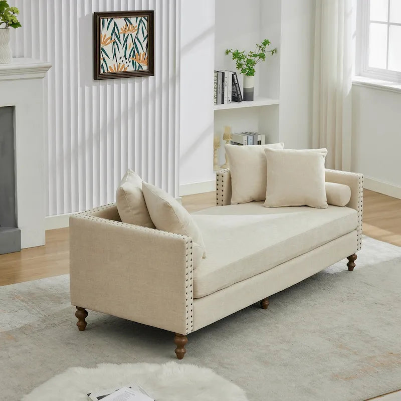- Accented By Aged Brass Nailheads:The square armrests are adorned with aged brass nailheads, adding a touch of medieval and classical elegance to the chaise. This unique detail sets it apart and gives it a sophisticated look.