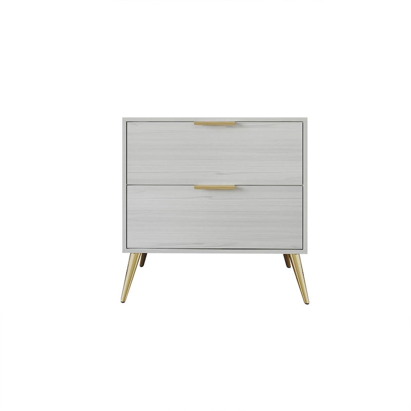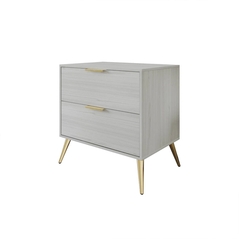 Enhance your bedroom's allure with this enduring nightstand, boasting sophisticated hues and a lavish design. It seamlessly harmonizes with your current furnishings, creating a unified and stylish aura. The nightstand offers two expansive drawers, presenting abundant storage options. Skillfully fashioned from a blend of solid and engineered wood, it guarantees unwavering stability and long-lasting durability. Amply supported by robust gold metal legs, the nightstand's contemporary charm is elevated by its exquisite gold drawer handles. The top surface serves as a convenient platform for essential items. Cleaning and assembly are hassle-free. Available in an array of captivating options - Black, White, Silver, and Grey - this nightstand facilitates an easy choice to suit your preference. Elevate your bedroom's sophistication and utility, achieving an elevated sense of refinement and practicality.