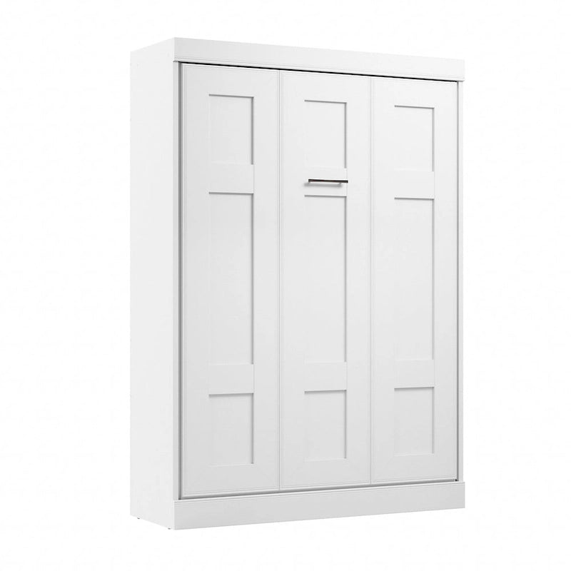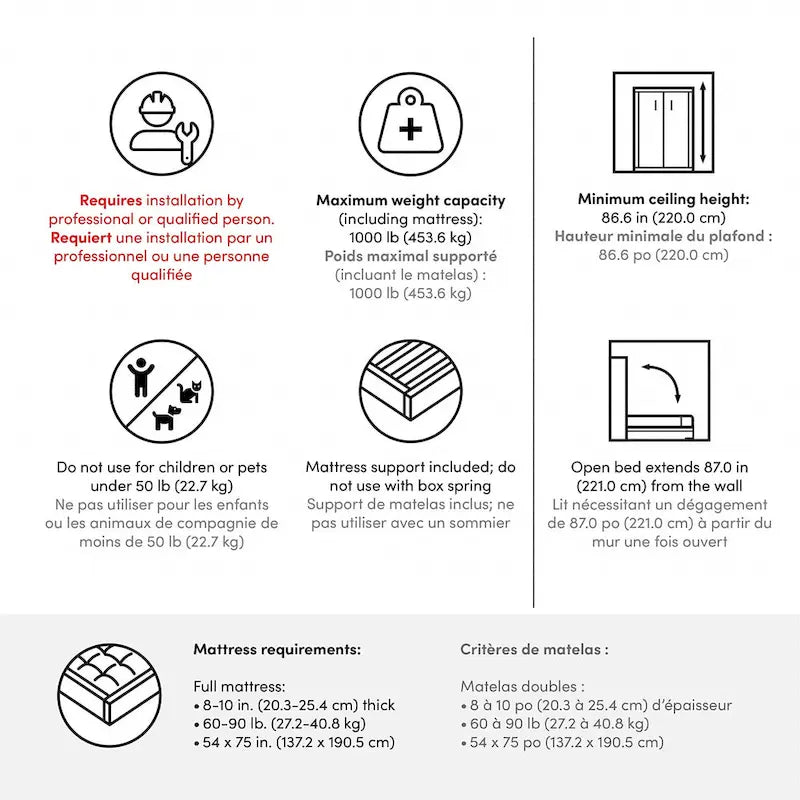 The Bestar Edge 60W Full Murphy Bed is an ideal space saver for your home. It allows you to transform any space into a beautiful multipurpose guest room. The mattress support uses flexible slats that follow the curves of the body and absorb pressure for your comfort. The Full Murphy bed can be used every night for a good night's sleep. The hidden bed folds up and down smoothly and quickly thanks to the dual piston system. Choose your own mattress since the bed accommodates most standard Full mattresses (8-10 inches thick, 60-90 lb, 54 x 75 inches) and supports up to 1000 lb (including mattress). The cabinet must be anchored to a wall with a minimum ceiling height of 86.6 inches. Allow a clearance of 30 to 36 inches around the open bed. The dual-mount bed mechanism attaches to the floor and wall for maximum stability and durability. To avoid risk of injury, the wall bed must be installed to the wall and floor structure by a professional or qualified person. Two people are required for assembly. Installation requires attachment to wood studs or masonry, removal of the baseboard, and drilling into the floor (if disassembly is required, holes may be covered with baseboards 0.5 inches or thicker). All necessary hardware is included. Do not use this product for children or pets under 50 pounds (22.7 kg). This Full-size Murphy bed is backed by the Bestar 10 Year Manufacturer's Warranty