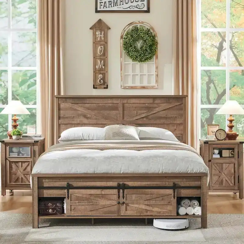 This bed frame features a classic farmhouse style design, exuding a unadorned yet elegant charm. The headboard adopts a cross design with its simple and natural colors, from country to modern minimalist, complementing both perfectly. This bed frame is equipped with sliding barn door storage cabinets, providing enough storage space. Whether it's for seasonal bedding, clothing, or other bedroom essentials, it can easily accommodate and keep the bedroom neat and organized. The bed frame is designed with noiseless mechanism, ensuring that you won't make any noise when turning over or getting up, providing you with a quiet and comfortable sleep environment. This high-quality thick bed frame is made of high-quality solid wood slats and MDF, durable and sturdy, with 20 solid wood slats naturally integrated into the robust frame, adopting curved plank construction design, and can withstand a weight of up to 800 pounds. No box spring required. This structure ensures that the bed frame does not wobble during use, providing your with a safe and comfortable sleeping environment.