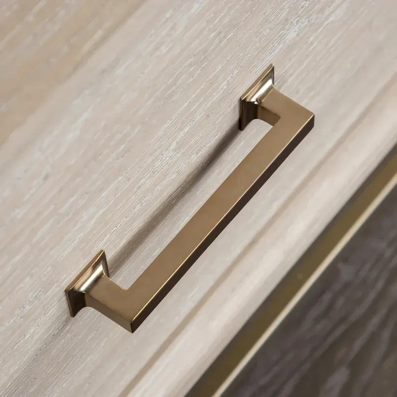 - Elegant gold metal drawer handles add a stylish accent