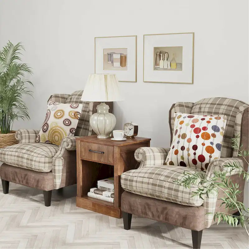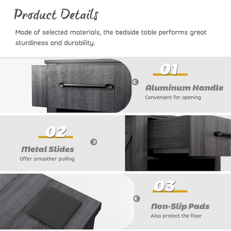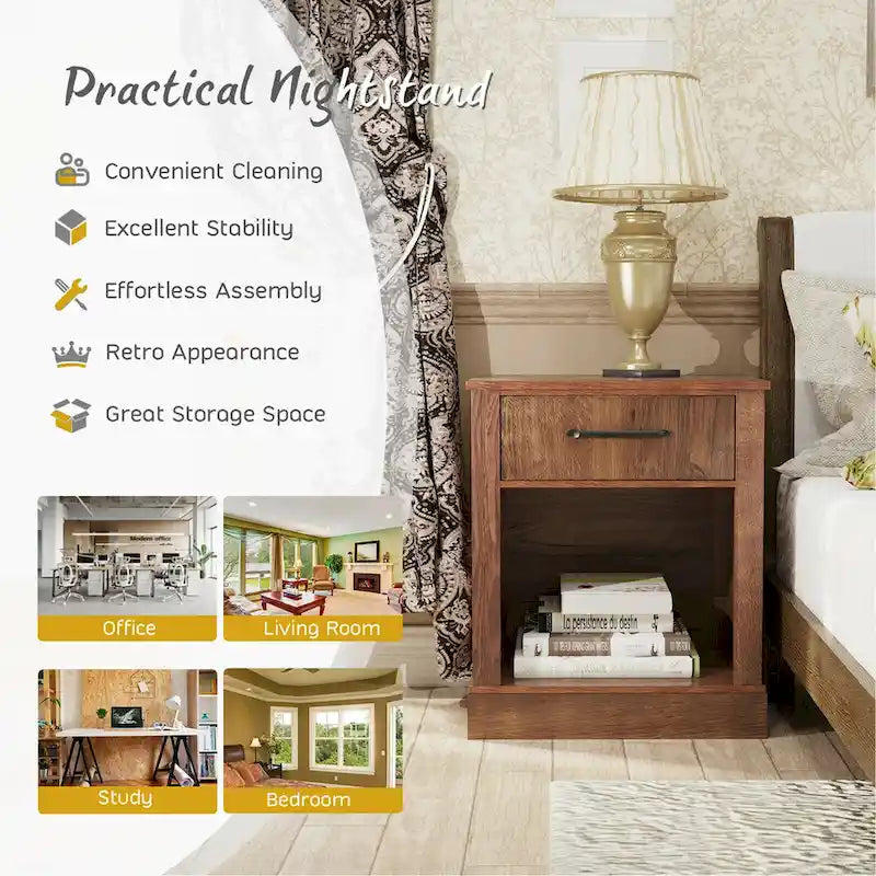 Featuring a compact design, our rustic nightstand is perfect for your bedroom, living room, lounge and office.Made of high-quality materials, it is excellent in sturdiness and has qualified weight capacity. Also, its four anti-slip foot pads further improve stability. Multiple storage areas provided help you keep your home tidy and neat. The tabletop is for commonly used items, such as cups, smart phones, lamps and more. The deep drawer can accommodate private medicines. Also, you can place diverse magazines in the lower compartment.