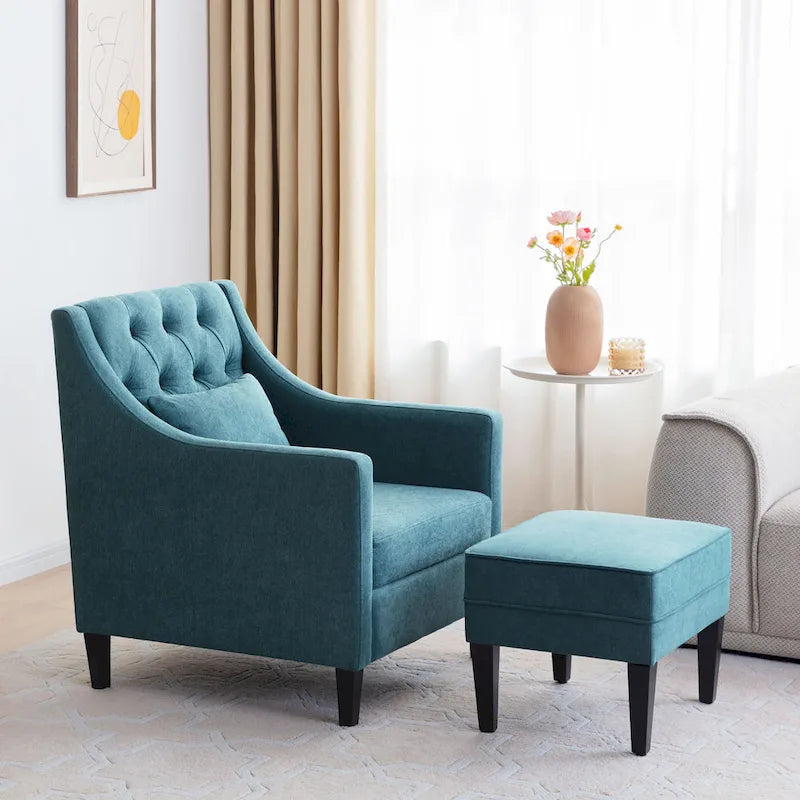 Experience the epitome of comfort and style with our Modern Cotton Linen Upholstered Armchair, a true masterpiece in seating. Crafted to perfection, this chair combines the allure of a solid wood frame with the indulgence of a high-resilient sponge, ensuring both durability and unparalleled comfort. The soft fabric lends a touch of luxury to any space, while the tufted design, integrated arms, and concise back create an elegant and inviting silhouette. Complete with a color-matched footrest and four anti-scratch pads, practicality meets aesthetics seamlessly. With its humanized armrests and soft, durable, skin-friendly fabric cover, this chair is a haven of relaxation. Embrace modern design at its finest as you sink into the embrace of this tufted accent chair, a testament to both aesthetics and comfort.