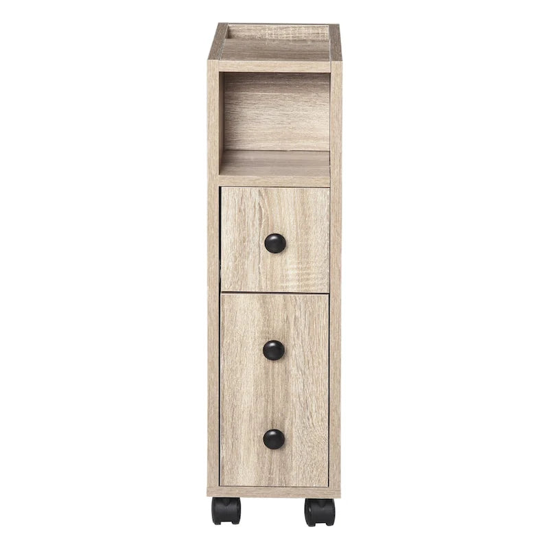 Kleankin is a good-looking and practical bathroom cabinet that will make you stop the first time you see it. Overall in oak wood grain color with black accents for decoration, it is skinny and free moving because of the compact design and the 4 rolling caster wheels. Practical with ample bathroom storage space for storing bathroom items. Versatile indoor decor fits the living room, bedroom, and entrance.