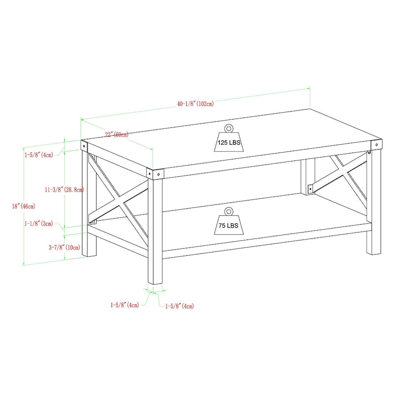 - Coffee table: 40 inches wide x 22 inches deep x 18 inches high (48 pounds)