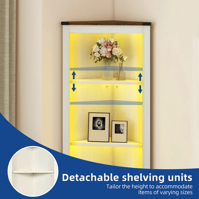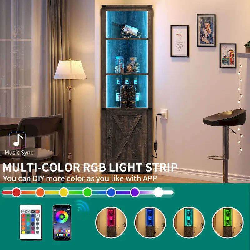 Moasis LED Corner Storage Cabinet with Light Farmhouse Tall Corner Cabinet with Barn Door Design