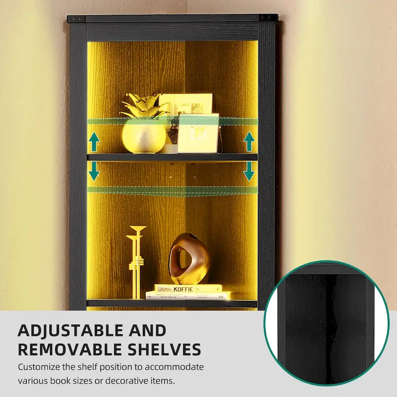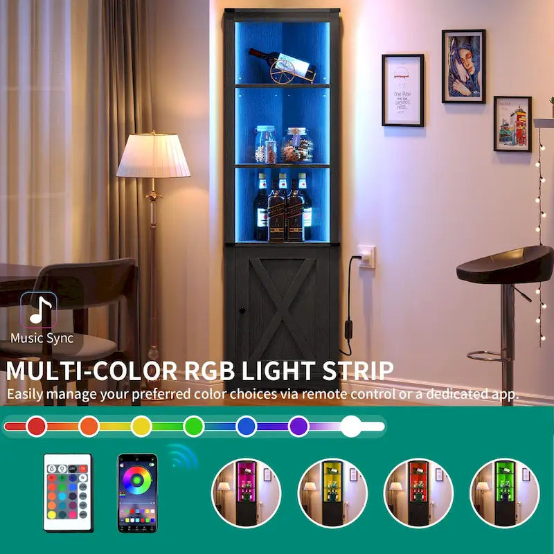 Our corner shelf with LED light combines style, functionality, and innovation. Crafted from premium MDF, it's sturdy and versatile, ideal as a wine cabinet, bookshelf, or display rack. The space-saving design fits any corner, providing open storage and a farmhouse-style cabinet. With 20 colors and 21 dynamic modes, the LED lights can transform your space to suit your mood, all controlled by a phone app or remote.
