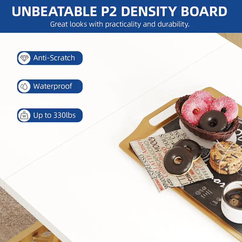 Introducing our Spacious and Stylish Dining Table, a modern blend of functionality and aesthetics. Its white and gold color block design and round-arc form perfectly complement any home decor. Built with a sturdy metal frame and durable wooden board, it offers longevity and easy maintenance. Versatile and elegant, it's the perfect choice for various occasions.