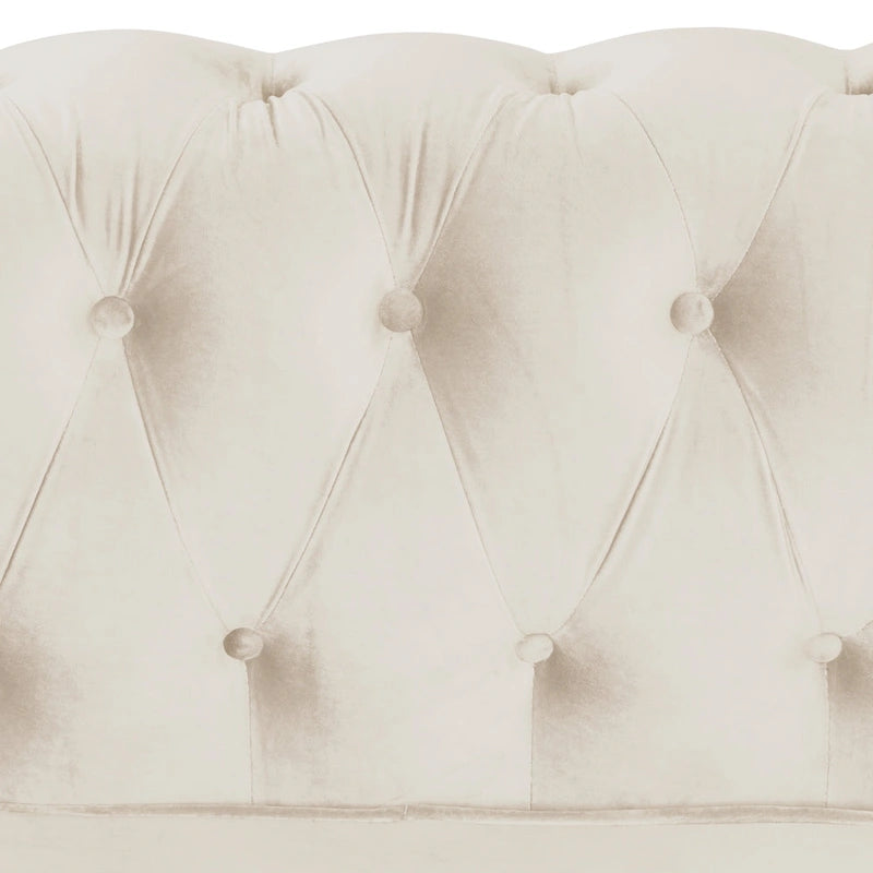 Unwind in style with our Morden Fort Tufted Velvet-upholstered Chesterfield Armchair. Sink into the cozy, poly fiber-cushioned seating, surrounded by soft and welcoming poly velvet upholstery. The button-tufted accents, scrolled arms, turned legs, and gleaming brass finish on arm-front nailhead trim accents add a touch of luxury to your space. Made with a robust rubberwood frame, this armchair is built to last. Choose from beige, blue, or grey to match your decor.