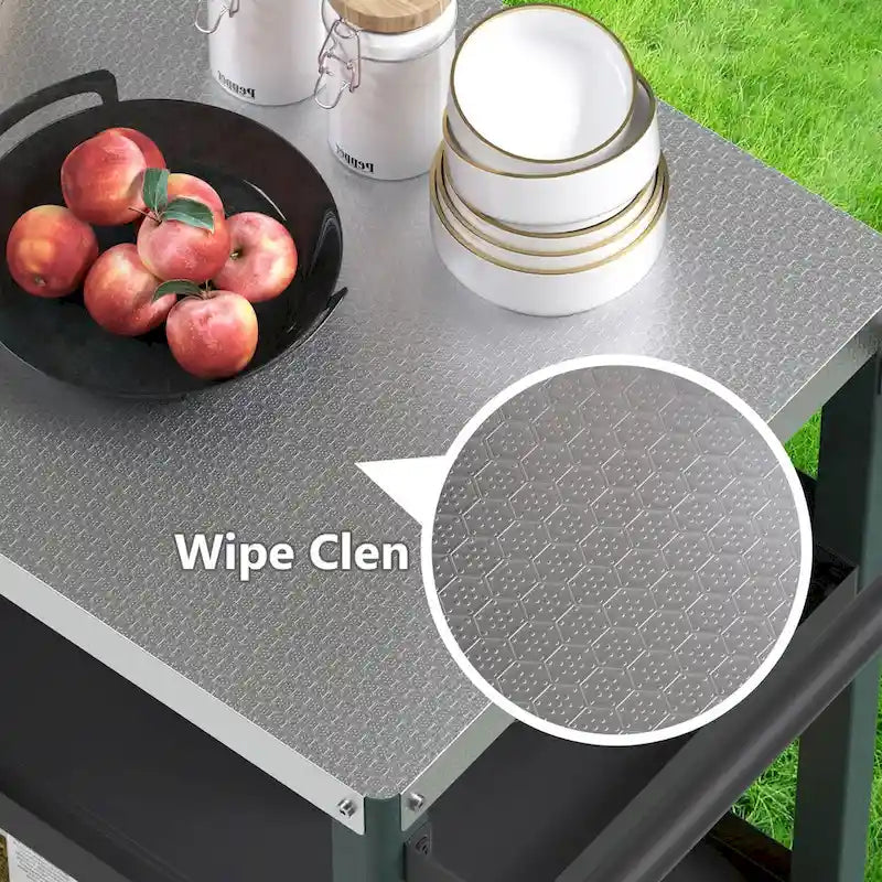 2.[All-weather Resistant Prep Table] Compared with plastic and other outdoor wood dining tables, the stainless steel table top is more durable and withstands rain, wind and sun. Plastic will inevitably deform over time, and wood is prone to mold in humid areas and cracks under direct sunlight. Besides, this prep table has 2 wheels and 2 table legs. Compared with 4 wheels, it is more stable and not easy to shake, so it is suitable for use in all regions and any weather.