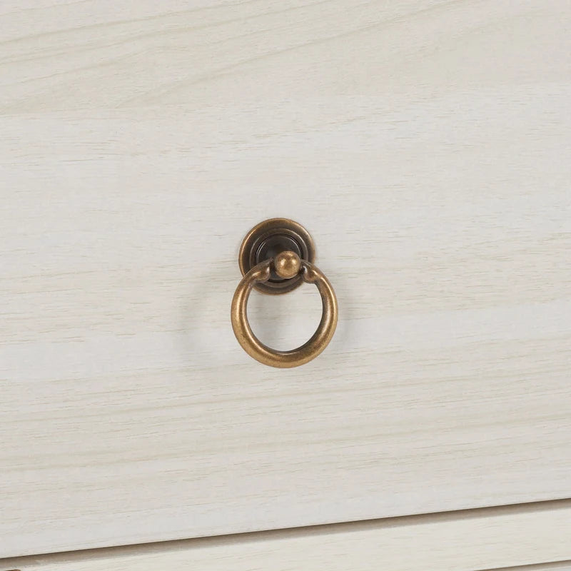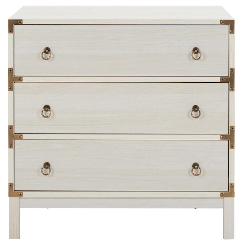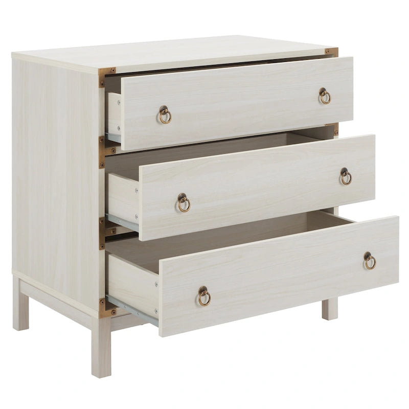 Organize all your essentials and belongings in our elegant and charming chest. Thoughtfully streamlined, the crisp and clean lines of our chest boast timeless aesthetics. It is gracefully perched and adorns a rich veneer to enliven your home. Being inspired by the effortless beauty of vintage style, our chest is finished off with ring pulls and gold hardware on the edges. An elegant and timeless addition, the chest includes three spacious drawers to serve as a practical storage solution for your living room, entryway, or bedroom.
