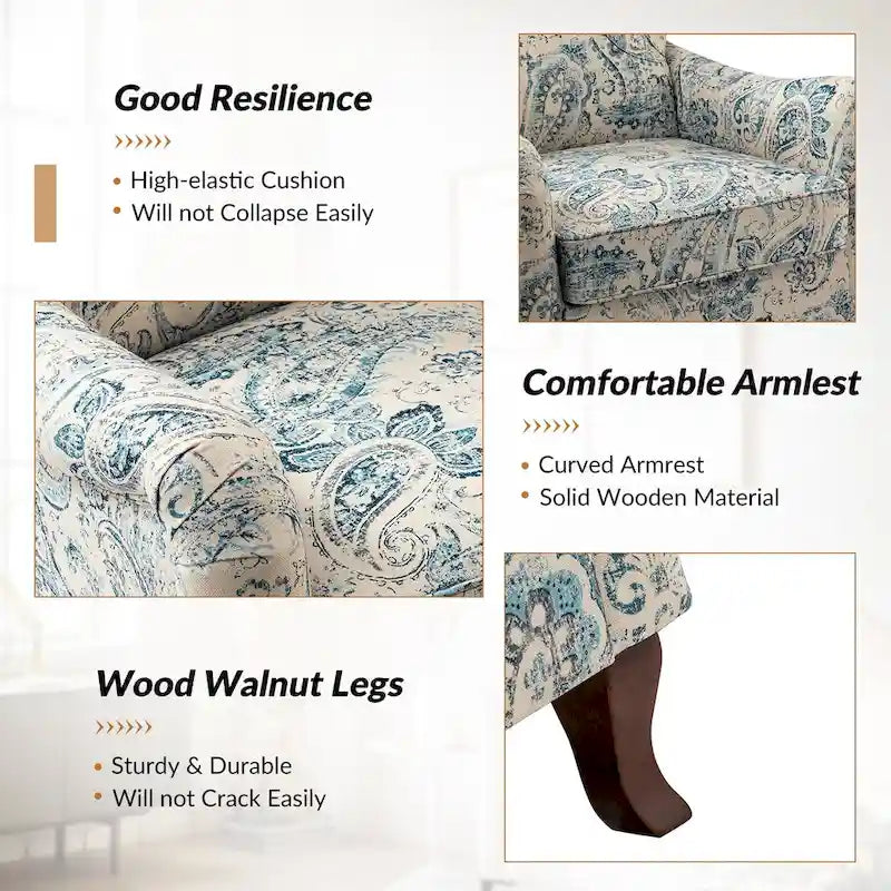 This farmhouse style armchair set creates an essential spot to sit back and enjoy a good book or catch up on your favorite show. The armchair set with an elegant silhouette is constructed with a solid and manufactured wood frame, and the seat is filled with thick foam and sinuous springs to ensure maximum comfort and support. It features a wide wingback and a unique armrest design that provides support for the arms and shoulders, allowing you to relax and unwind. The fabric upholstery on the chair set body is adorned with a floral pattern and the graceful contours of the armrests, adding a touch of sophistication to your living space. As the fushion of traditional, classic, transitional elements, this armchair set is a perfect way to add a much-needed extra resting spot to your seating arrangement while also helping to emphasize your living room style, making it a great finishing touch.