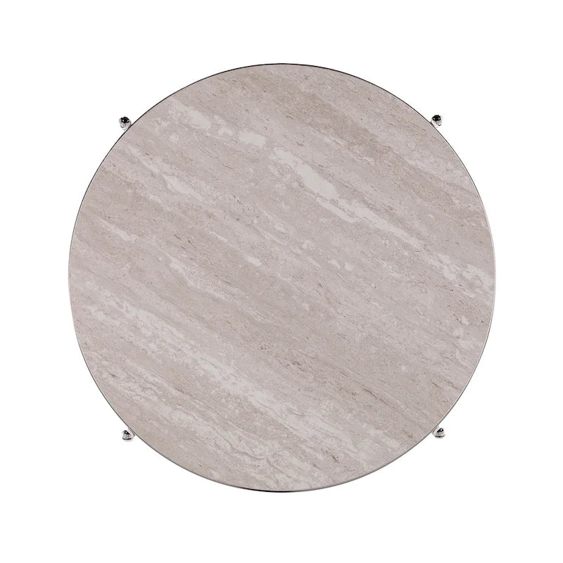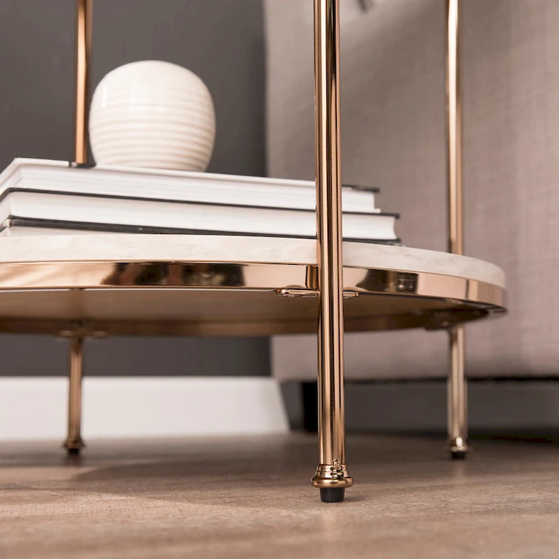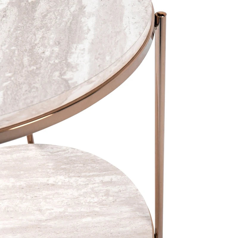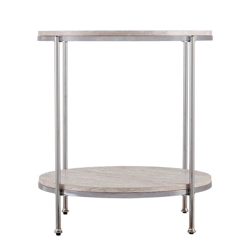 Add a touch of sophistication to your living area with the SEI Furniture Henderson Round Faux Stone Side/End Table. The table features a spacious tabletop and shelf for convenient storage, while the champagne body and simulated travertine veining create an exquisite look that varies slightly for a unique appearance. With its glam to modern style and round design, this faux stone side table is perfect for any living room or open concept living space.