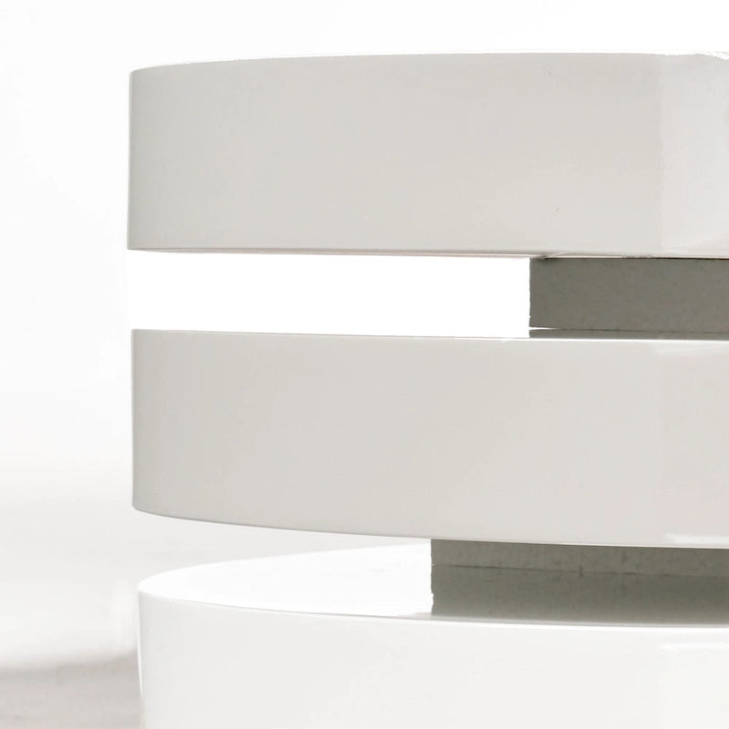 Contemporary and versatile, this oval coffee table will add a distinctive touch to your decor. The 3-layer coffee table is crafted from sturdy plywood with a white high gloss finish, and features a rotating top and second layer that can swivel outwards to create a larger surface. The low-profile coffee table is perfect for adding unique function to your modern space.