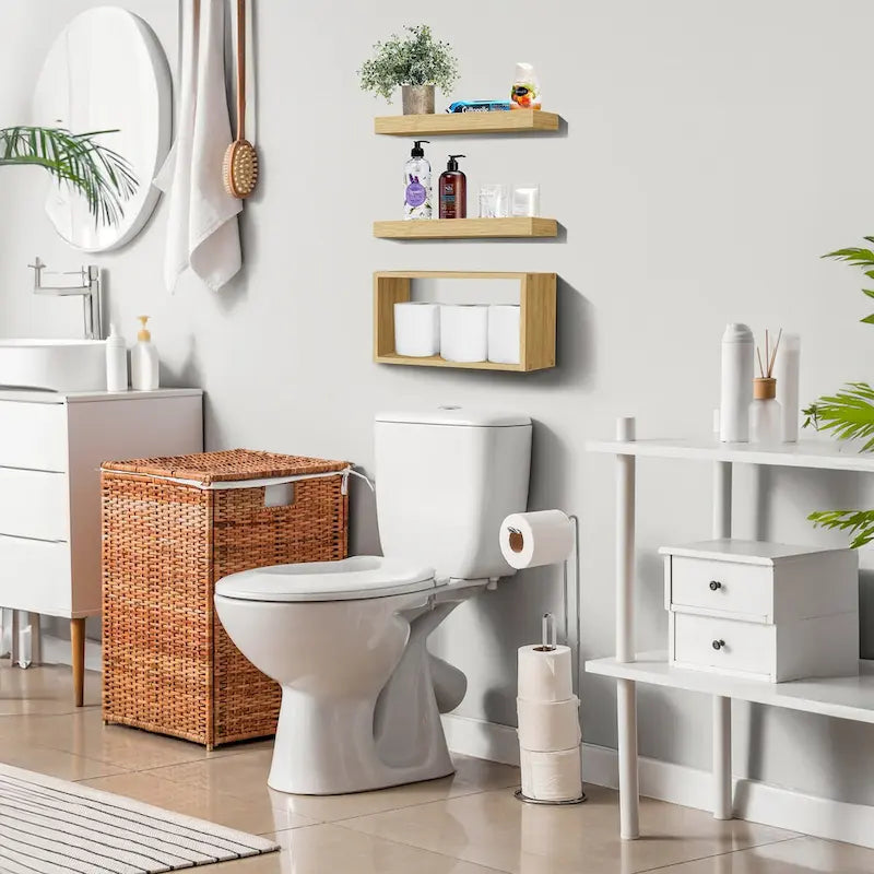 Transform your bathroom into a spa-like retreat! Use the flat bathroom shelves to showcase candles, decorative jars, or small plants. The open box shelf provides a convenient and accessible spot to store extra toilet paper or other bathroom necessities.