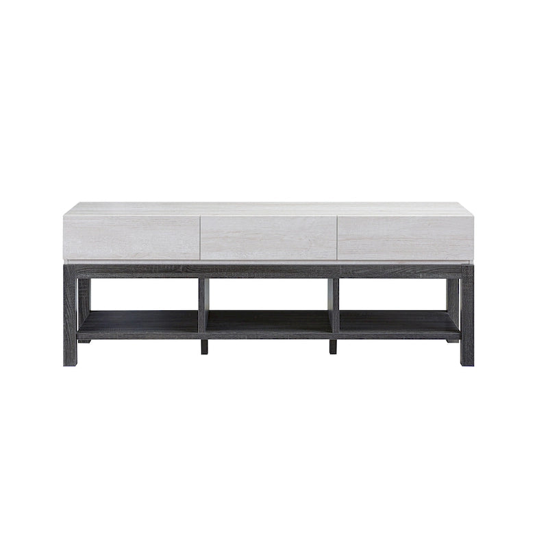 Eye-catching in a combination of white oak and distressed grey finishes, this modern TV stand creates a calm, welcoming ambiance in your living room. Its darker open base features three open compartments perfect for media components, storage, and display. On top, three light and bright drawers create a spot to stash everything from games to accessories.