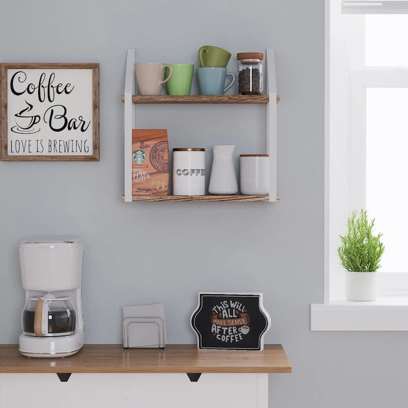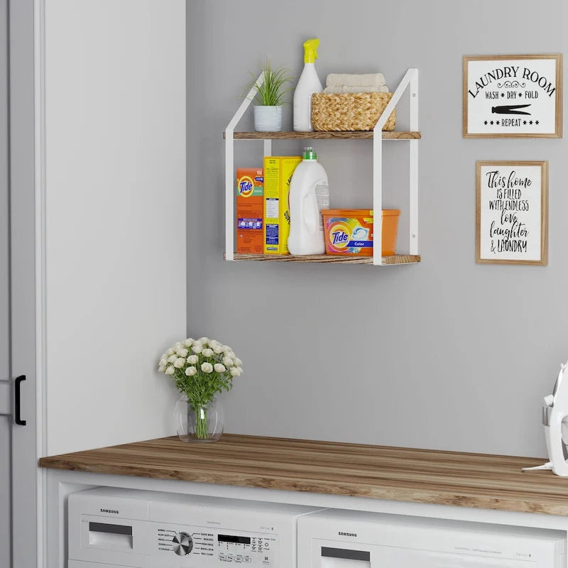 Add rustic flair to your bathroom with this 2 tier floating shelf set. An over the toilet storage unit will be a perfect storage solution for your tiny bathroom. Utilize these functional storage shelves on dull wall space and create an eye catching wall decor. They will make perfect floating bookshelves thanks to the side support provided by their shelf brackets. You can also display decorative objects, indoor plants, collectibles and more.