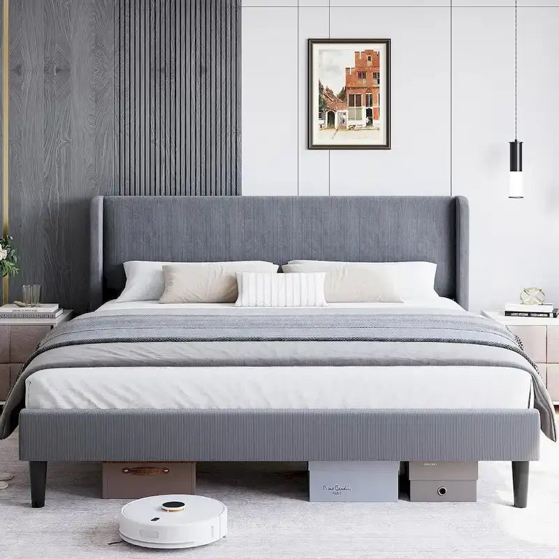 Product Description This full/queen/king size bed frame with an upholstered headboard and wingback can create a quiet and cosy resting environment for you and your family. The upholstered headboard is made from premium velvet and filled with a high-density sponge, which can be used to create a cosy back cushion for reading. The ingenious combination of material and design is aesthetically pleasing. The bed is well supported by 12 sturdy wooden slats, 2 wide steel tubes and 2 thicker bed legs & 2 sturdy wingbacks at the front and back, which have a large contact area with the ground. You can roll, wrestle and even jump on the bed at will. At the same time, the curved bed leg effectively protects children from bumps, so they don't have to worry about getting hurt. Thoughtful and stylish design, high quality materials and solid construction give you a good night's sleep.Let's get a good night's sleep with this bed frame!