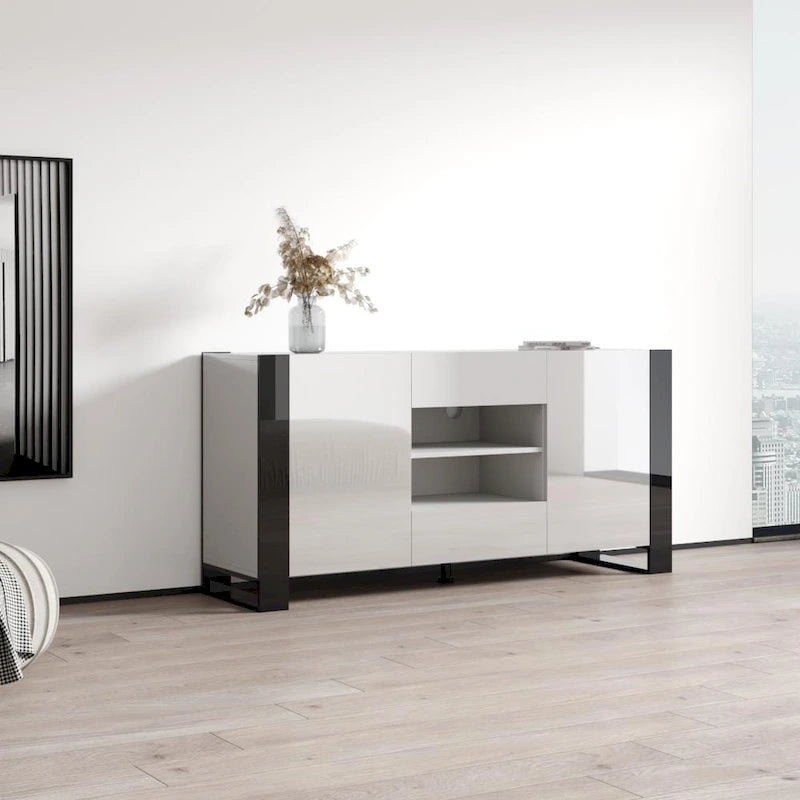 Upgrade your dining space with the Woody Modern 64.5-inch Sideboard Buffet. This versatile piece, made from engineered woods and metal, can be used as a sideboard, buffet, or credenza. Its high-gloss front and matte body create a modern, unique, and contemporary design that will elevate the style of any room. Weighing 125 lbs., this sideboard measures 64.5 inches wide x 17.5 inches deep x 31.5 inches tall. Choose from three finish options: oak with grey, white with black, or white with grey.